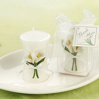 A study in sophistication. This small candle elevates favors from a small token of appreciation, to a truly elegant addition to your reception decor. A lovely vaselike profile is just one of the unique aspects of this little candle. Handrolled fabric lily is tied with miniature silken ribbon, presenting a tiny and perfect bouquet. The candle arrives in a completely transparent box, showcasing it from all angles which is then tied with a sheer white ribbon and attached Calla-themed "Thank You" tag. Box measures approximately 1.75 inches wide by 2.5 inches tall. Maximum burn time is approximately 2 hours..../ David's Bridal Calla Lily Vase Shaped Candle Style 20043NA / Calla Lily Vase